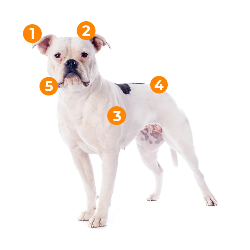 A pele sensível e as dobrinhas do Bulldog Americano criam ambientes propícios para proliferação de parasitas, como pulgas, carrapatos e ácaros.