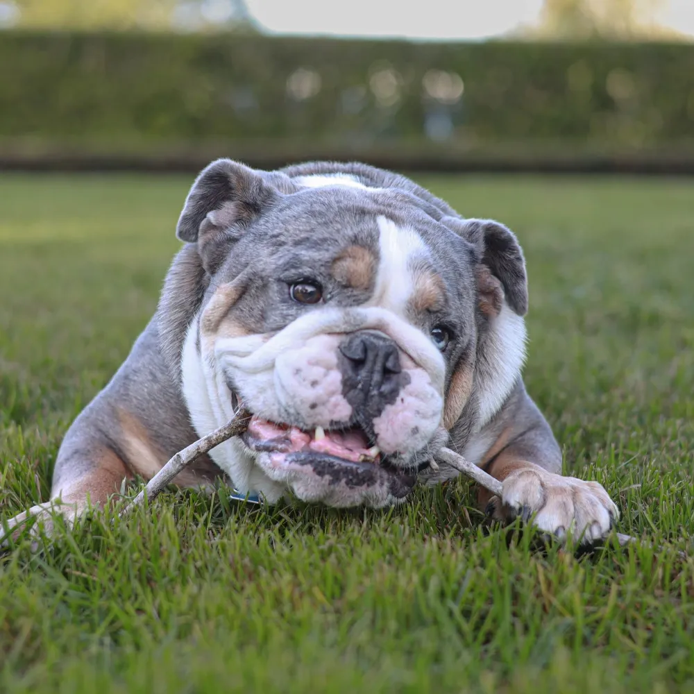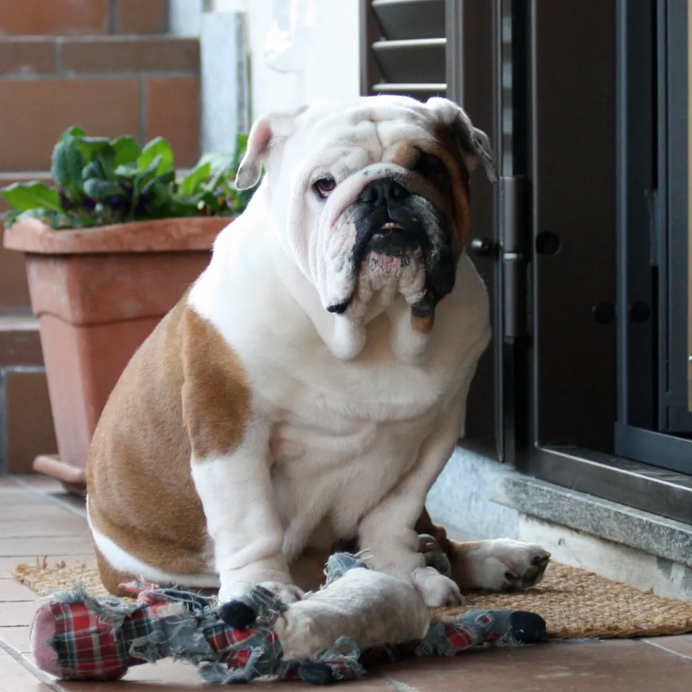 O Bulldog é um mordedor persistente, independentemente da idade. Por isso, precisa ter sempre brinquedos de mastigação resistentes disponíveis, principalmente quando fica sozinho. Isso reduz a ansiedade e evita que destrua móveis ou objetos da casa.