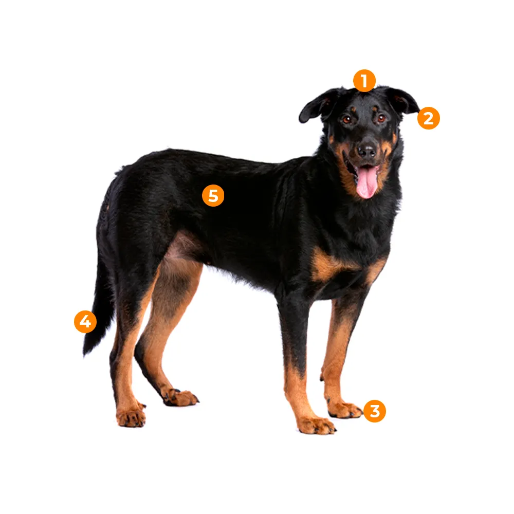Além disso, o rosto mais largo, o corpo mais robusto e os ergôs duplos nas patas traseiras são traços únicos do Beauceron — o que facilita a diferenciação entre as raças.